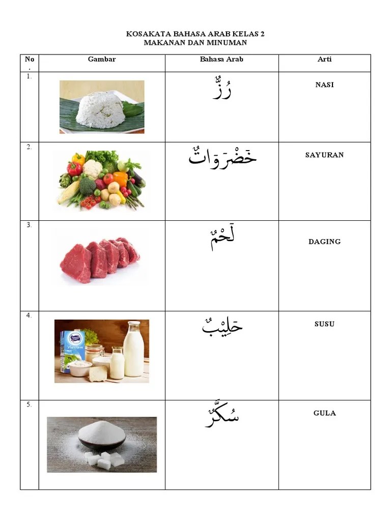 Sama seperti di indonesia, di arab nasi juga masih menjadi salah satu makanan pokok. Makan dan minum adalah kebutuhan primer manusia demi . Inilah kosa kata atau mufrodat bahasa arab tentang makanan dan minuman, dalam bentuk isim mufrod dən isim jamak. Dan pada kesempatan ini, saya akan membagi kosakata baru tentang makanan dan minuman. Kosakata makanan dan minuman dalam bahasa arab. الشهية eshshahiya · nafsu makan ; Kosakata bahasa arab tentang makanan dan minuman ini sudah kami lengkaip dengan artinya atau terjemahannya dan juga cara membacanya dalam .